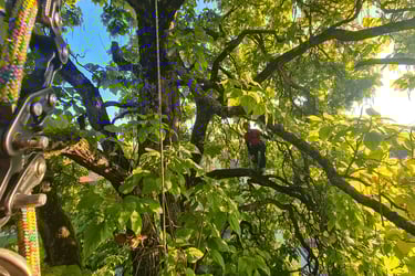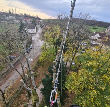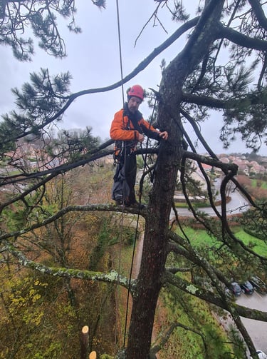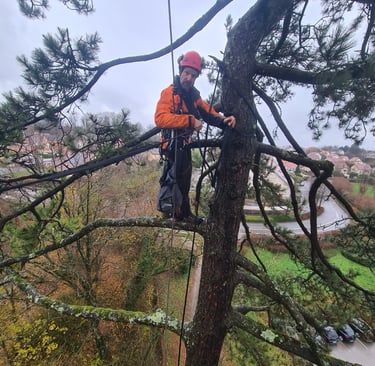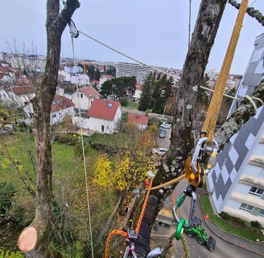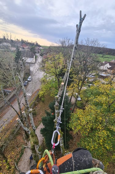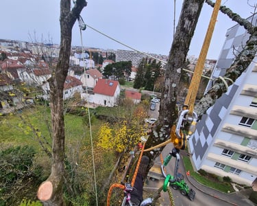 Démontage par rétention si nécessaire : Nous retirons l’arbre par tronçons, en les descendant à la corde grâce à un système de freinage. Cela permet d’éviter des structures et tout impact au sol.